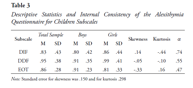 The means, standard deviations, skewness, kurtosis, and internal consistency estimates (Cronbach’s alphas) of the Alexithymia Questionnaire for Children are presented in Table 3. Reliability was acceptable for the DIF scale, with α of .74, and low for the DDF and EOT subscales (α =.55 and .47 respectively). Nevertheless, according to current criteria to assess internal consistency (George & Mallery, 2003), the DDF reliability estimate is considered low but not unacceptable. In addition, this low estimate can be attributed to the fact that there are only five items on the scale. For this reason, some studies (Mishra et al., 2012) have used a composite measure that merges the DIF and DDF items into one scale. If a composite measure of DIF and DDF were to be considered, the internal consistency for such combined scale would be α = .75. Similar to findings of several previous studies (Mishra et al., 2012; Rieffe et al., 2006, 2010) the EOT scale had poor reliability within the Peruvian sample. Independent samples t-tests were conducted to test for gender differences among the mean levels of the subscales. No significant differences were found among boys and girls for either of the subscales. Finally, correlations between subscales were as follows: DIF and DDF, r = .50, p <.01; EOT was not significantly correlated to either DIF or DDF.