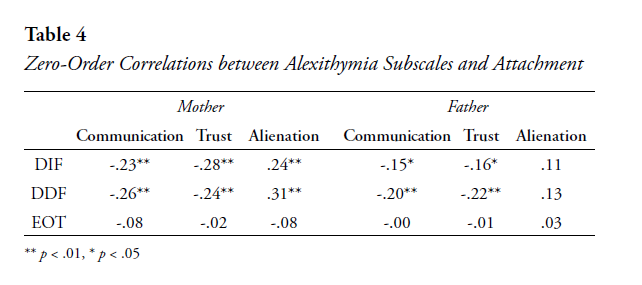 Regarding parental attachment, we found a negative association between alexithymia and both paternal and maternal trust and communication. Additionally, we found a positive association between alexithymia and maternal alienation. These findings imply a relationship between maladaptive attachment patterns and cognitive alexithymia (difficulties identifying and describing feelings). Even though the measure of parental attachment used on this study was dimensional and not style-based, these results are comparable to others that found a positive association between alexithymia and pathologic attachment styles. For example, a recent study found significant associations between the inability to analyze, identify, and verbalize emotions, and insecure attachment strategies (Koelen, Eurelings-Bontekoe, Stuke, & Luyten, 2015). Similarly, Oskis and colleagues, (2013) found higher levels of alexithymia among anxious and avoidant insecurely attached groups of adolescents compared to the securely attached participants. Furthermore, they reported that the anxious attachment style significantly predicted alexithymia scores, indicating that early-life disruptions on the attachment process could have an effect on emotional awareness and self-regulation during adolescence.