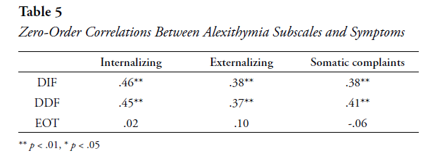 To assess convergent validity, the associations between alexithymia and both attachment and symptomatology (in terms of somatic complaints and internalizing and externalizing symptoms) were explored. Zero-order correlations are presented in Table 4, which shows the correlations between the alexithymia subscales and parental attachment measures (communication, trust, and alienation), and Table 5, which shows the associations between the alexithymia subscales and symptomatology.
