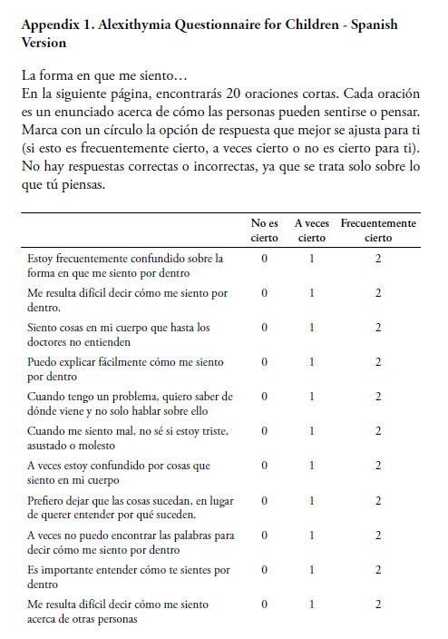 The Alexithymia Questionnaire for Children, the first self-report measure of alexithymia for children, which is based on the TAS 20, was published in 2006 (Rieffe, Oosterveld, & Terworgt, 2006). It was originally published in English and Dutch, and has more recently been validated in Italian, Hindi, and Farsi (Di Trani et al., 2009; Mishra, Maudgal, Theunissen, & Rieffe, 2012; Rieffe et al., 2010). To date, no Spanish version has been validated.