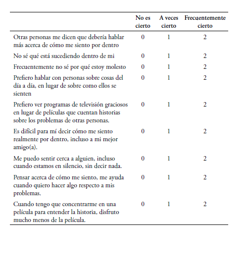 Most published research on alexithymia in children and adolescents has focused on associations between alexithymia and internalizing symptoms (e.g., somatic disorders) and/or pathological attachment patterns. The link between alexithymia and somatic complaints among children has been repeatedly established (Jellesma, Rieffe, Terwogt, & Westenberg, 2009). Insecure and disorganized attachment in children have been associated with deficiencies in internal state language and the vocabulary of emotion and cognition (Lemche, Klann-Delius, Koch, & Joraschky, 2004). Similarly, higher levels of alexithymia have been encountered among anxious and avoidant children and adolescents than insecurely attached groups (Oskis et al., 2013). Only limited research has been carried out in the Spanish language, and to our knowledge, no studies have been conducted with self-report measures of alexithymia specifically designed for Spanish-speaking populations of children and adolescents. Most of the Spanish language research related to the construct of alexithymia has used the adult version of the TAS-20 (Cruz-Saez, Pascual, Etxebarria, & Echeburua, 2013).