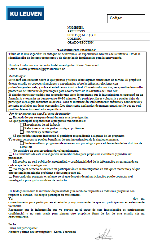 The current study was part of a larger longitudinal study about childhood trauma and adolescent mental health in Lima, Peru. A subsample of 265 adolescents aged between 11 and 18 years (M = 14.15, SD = 1.50) that completed the alexithymia questionnaire at the first time of data collection (that was part of a pilot study) was considered for this cross-sectional study. Data collection took place at a public high school in Villa El Salvador, Lima, Peru. Equal gender distribution was aimed for, achieving a final sample of 50.2% boys and 49.8% girls.