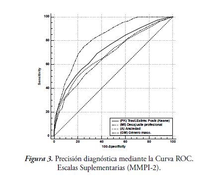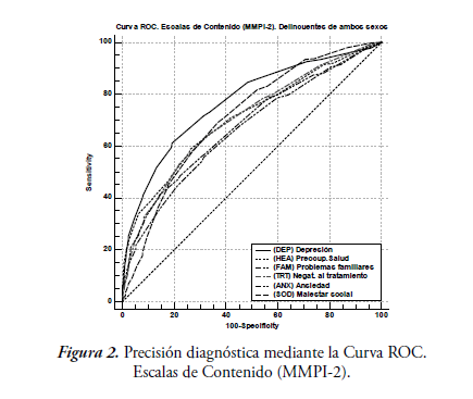 En este estudio se ha utilizado también esta metodología, aportada por la curva ROC, para detectar la precisión diagnóstica del MMPI-2 con los conjuntos de variables psicológicas integrantes en la prueba. Aunque no son frecuentes este tipo de análisis, no obstante, los investigadores cada vez utilizan más esta metodología para poder evaluar la precisión diagnóstica con el MMPI/MMPI-2 (Burgueño, et al. 1995; Jiménez, Sánchez & Tobón, 2009; Jiménez, Sánchez & Ampudia, 2009; Nicholson, Mouton, Bagby & Buis, 1997; Sánchez y Jiménez, 2003; Sánchez, Jiménez y Ampudia, 2008).