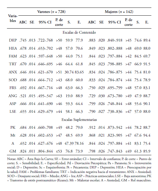En la Tabla 2, sobre el análisis comparativo entre varones y mujeres, se puede apreciar dos conclusiones importantes: (1) Un mayor número de variables que superan el ABC>0.70 en las mujeres, (2) las notables diferencias entre ambos sexos, siendo, sensiblemente superiores, la precisión diagnóstica, en las mujeres. De forma resumida, el MMPI-2 presenta una mayor precisión diagnóstica global (ABC>0.70) en las mujeres en las siguientes áreas y variables: