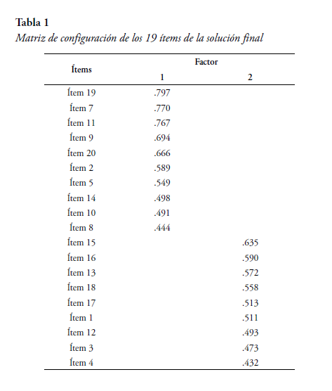Sobre la base de estos resultados se volvió a analizar factorialmente los datos utilizando Máxima Verosimilitud como método de extracción, ya que la literatura sugiere este método cuando se cumple el supuesto de normalidad (Fabrigar, MacCallum, Wegener & Strahan, 1999). Se especificó una solución de dos factores utilizando rotación oblicua Promax, ya que la matriz de correlación de factores evidenció la intecorrelación entre los mismos. En relación a los criterios de inclusión de los ítems se utilizaron: 1) que tuvieran un peso factorial de .30 en algún factor, 2) que no se presentaran un peso de similar magnitud o superior en otro factor. De esta manera, se eliminó el ítem número seis, el cual presentaba un peso factorial de .30 y se presentaba en dos factores, puntuando en uno .30 y en el otro .31, quedando conformado el factor 1 con 10 ítems y el factor 2 con nueve ítems, con cargas factoriales entre .44 y .78 (Ver Tabla 1) y explicando el 58 % de la varianza conjunta de la escala. El examen del contenido de los ítems permitió interpretar el factor 1 como Justificación Moral y el factor 2 como Culpabilización.