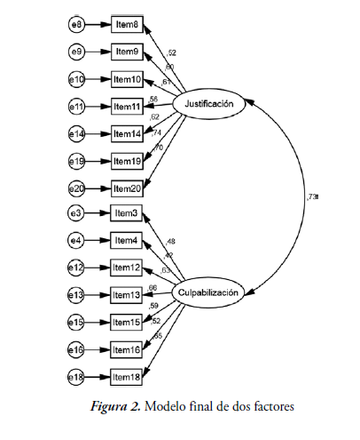 Finalmente, se calculó la fiabilidad compuesta de cada factor, utilizando la fórmula sugerida por Hair et al. (1999). Se observó una adecuada fiabilidad en los dos constructos latentes, cuyos coeficientes presentaron valores considerados buenos y muy buenos (.82 para Justificación Moral y .77 para Culpabilización).