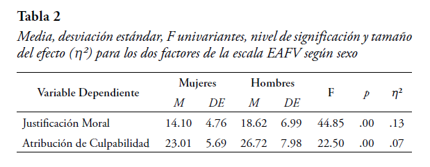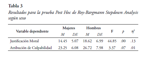 Los resultados para el contraste Lambda de Wilks fueron significativos, observándose un F (24.286) p≤ .001, para una potencia observada alta, y un tamaño del efecto Alto h2 = .135. En los contrastes Post Hoc sobre el impacto de la variable sexo en la Justificación Moral y la Atribución de la Culpabilidad mediante contrastes ANOVA univariados, se pudo observar que hay diferencias significativas en el factor sexo. Los resultados son presentados en la tabla 2.