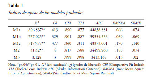 Varianza común del método. En siguiente lugar, dado que todos los datos están basados en autoinformes y fueron recogidos en el mismo periodo de tiempo, la varianza común asociada al método (Common Method Variance) puede sobreestimar o infravalorar las relaciones entre variables (Podsakoff, MacKenzie & Podsakoff, 2012). Para examinar el posible efecto de la varianza común, se puso a prueba un tercer modelo (M1c) donde todos los ítems de las escalas del estudio saturaban en solo un factor. El ajuste del modelo M1c fue insatisfactorio (Tabla 1). En consecuencia, aunque no puede excluirse totalmente el efecto de la varianza común, no parece afectar de forma significativa a las relaciones entre las variables estudiadas.