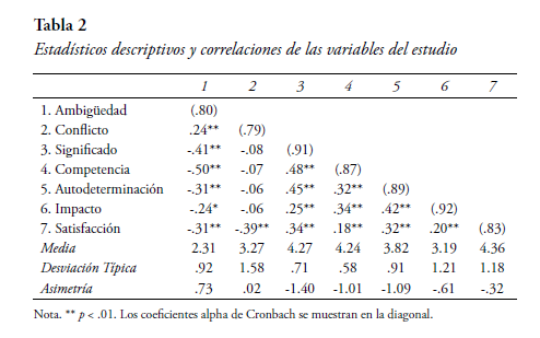 La Tabla 2 muestra los estadísticos descriptivos —medias, desviaciones típicas, asimetría— y correlaciones de las variables del estudio, junto con la fiabilidad de las escalas. Tanto la ambigüedad como el conflicto de rol registraron valores inferiores a la media de la escala, siendo el valor más bajo el correspondiente a la ambigüedad de rol. Relativamente a las dimensiones del empowerment psicológico, sus valores medios se situaron por encima de la media de la escala, con el valor más elevado el correspondiente a significado y el más bajo a impacto. Finalmente, la satisfacción laboral se situó por encima del valor medio de la escala.