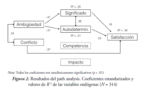 Frente al impacto directo del conflicto de rol sobre la satisfacción laboral, la ambigüedad de rol fue totalmente mediada por las dimensiones significado e autodeterminación del EP. La ambigüedad de rol ocurre cuando una persona no sabe cuáles son sus tareas y responsabilidades en un puesto dentro de una empresa (Cervoni & Delucia-Waack, 2011; Osca et al., 2003). De acuerdo con la teoría de rol (Rizzo et al., 1970), cada posición en la organización debe tener claramente definidas sus tareas y responsabilidades. Si los trabajadores no conocen su grado de autoridad/autonomía y sus tareas y responsabilidades, estos vacilarán cuando deban tomar decisiones (falta de autodeterminación) sintiéndose menos motivados y satisfechos en el trabajo. Por otro lado, solo cuando las personas entienden su papel en la organización, perciben que su trabajo tiene sentido y significado en el global de la empresa, aumentando sus percepciones de significado y sus niveles de satisfacción laboral (Cicolini et al., 2013; Seibert et al., 2011; Spreitzer et al., 1997).