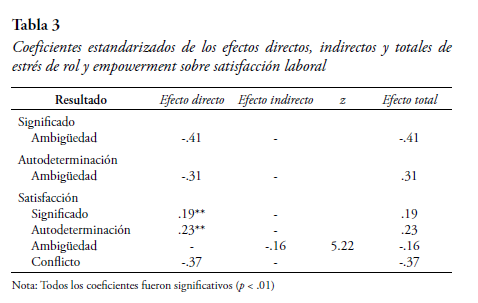 Relativamente al papel mediador del empowerment psicológico en el trabajo entre el estrés de rol y la satisfacción laboral, las dimensiones autodeterminación y significado mediaron totalmente el impacto de la ambigüedad de rol sobre la satisfacción, z = -5.22, p < .01. En el caso del conflicto de rol, su impacto sobre la satisfacción laboral fue directo (-.37, p < .01), sin existir cualquier tipo de mediación a través del empowerment psicológico. En la Tabla 3 se muestran los efectos directos e indirectos sobre la satisfacción laboral.