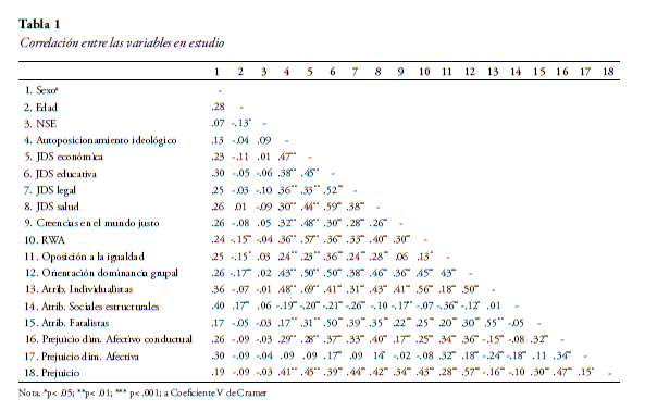 En primer lugar, se observó que las cuatro dimensiones de la JDS aquí analizadas correlacionan entre sí de forma positiva y fuerte. A su vez, las diversas dimensiones de la JDS presentan relaciones positivas y significativas con todas las variables ideológicas consideradas (CMJ, RWA, ODS y autoposicionamiento ideológico). Por su parte, al indagarse las relaciones entre la JDS con las atribuciones acerca del origen de la pobreza se observaron relaciones positivas y significativas de aquellas con atribuciones individualistas y fatalistas. En contraposición, las atribuciones sociales-estructurales mantienen una relación negativa y significativa con las cuatro dimensiones de la JDS. En otro orden, las cuatro dimensiones de la JDS mostraron relaciones positivas significativas con los componentes afectivo-conductual y cognitivo de la escala de prejuicio hacia personas pobres. La dimensión afectiva solo presenta relaciones positivas significativas con la JDS en el acceso a educación, y esta es débil. Finalmente, las variables sociodemográficas no mostraron relaciones significativas con las dimensiones de la JDS (ver tabla 1).