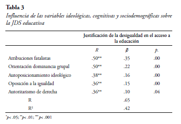 En lo que concierne a la JDS educativa, se observa que las atribuciones fatalistas en torno a la pobreza y la ODG son las variables que más aportan a la predicción de esta dimensión. En ambas variables la influencia es de signo positivo. Por su parte, las demás variables (autoposicionamiento ideológico, OI y RWA) también aportan poder predictivo, de signo positivo en los tres casos, aunque en menor medida que las variables mencionadas anteriormente. Las cinco variables en su conjunto, explican el 42% de la varianza de la JDS en el acceso a la educación (R2=.42) (ver tabla 3).