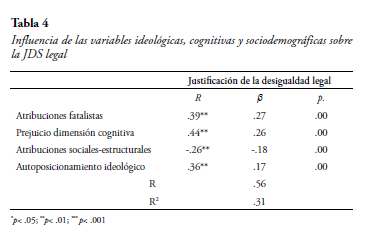 Con relación a la JDS legal, se observa que las atribuciones fatalistas en torno a las causas de la pobreza nuevamente se ubican como la variable que más aporta a la predicción, seguida por el prejuicio hacia personas pobres en su componente cognitivo. En ambos casos la influencia es de signo positivo. También las atribuciones sociales-estructurales y el autoposicionamiento ideológico aportan poder predictivo, aunque en menor medida.