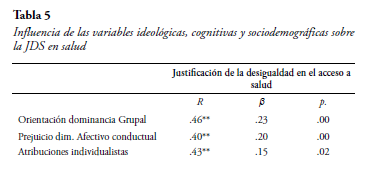 Finalmente, en la tabla 5 se puede observar que la ODG y el pre juicio en su dimensión afectivo-conductual son las variables que más aportan a la predicción de la JDS en el acceso a la salud. En ambos casos la relación es de signo positivo. También las atribuciones individualistas y fatalistas sobre las causas de la pobreza, el RWA y la edad del(a) encuestado(a) aportan a la predicción de la JDS, mediante una influencia positiva. En conjunto estas variables explican el 34% del total de la varianza en relación a la justificación de este tipo de desigual dad (R2=.34) (ver tabla 5).