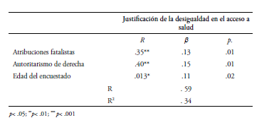Por último, en lo vinculado a la JDS en el acceso de la salud se observa a la ODG como predictor más relevante. Esto indica que las personas con una fuerte ODG exhiben una tendencia a mantener una jerarquía social desigual justificando este tipo de inequidad, y a su vez atribuirán a los grupos subordinados características negativas. Ello puede relacionarse con la segunda variable que aporta mayor predicción: el componente afectivo-conductual del prejuicio hacia las personas pobres. En ambas se hace hincapié sobre la devaluación del exogrupo y la mayor valoración del grupo dominante, manifestándose en un mayor acceso a recursos como la salud en favor al endogrupo y el rechazo hacia los otros, en este caso las personas pobres.