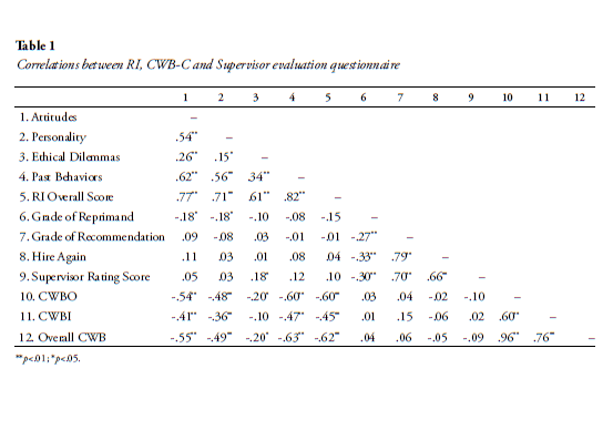 In terms of the relationship with the self-report measure, integrity scores were highly and inversely correlated with counterproductive work behaviors towards the organization (CWB-O): r = -.54,-.48,-.20,-.60 for Attitudes, Personality, Ethical dilemmas and Past behaviors dimensions, respectively. The correlation between the RI Overall Score and CWB-O was significant and strong r(151)=-.60, p<.01. (See table 1)