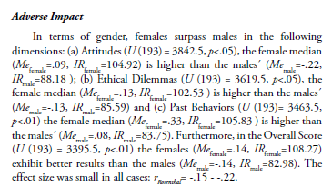 It is expected that the self-reported and the external criteria will present medium or large correlation coefficients with the RI. Also, the scores of the measures are expected to be inversely related to the multi method integrity test. Adverse Impact for gender will also be tested, and female students are expected to present higher scores on the RI than male students.