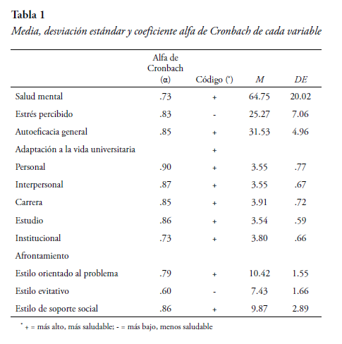 Morton, Mergler y Boman (2014) señalan que los estudiantes que presentan altos niveles de autoeficacia son capaces de reconocer sus.habilidades para afrontar las demandas académicas. De esta manera, los estudiantes que presentan altos niveles de autoeficacia y bajos niveles de depresión experimentan menos estrés durante el primer año de estudios y logran adaptarse mejor a la vida universitaria. Además, la autoeficacia presenta una relación positiva con el uso de adecuadas estrategias de afrontamiento (Chýlová & Natovová, 2013) y se relaciona de manera significativa e inversa con la depresión, la ansiedad y el estrés (Ghaderi, 2009; Morton et al., 2014; Varghese, Norman & Thavaraj, 2015). Esta variable psicológica también predice el funcionamiento físico y social, los cuales son consideradas áreas de la salud percibida (Posadzki et al., 2009).