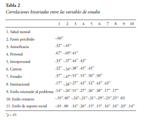 En cuanto al análisis de correlaciones (Tabla 2), los coeficientes más fuertes se encontraron entre salud mental y estrés percibido (r= -.66, p<.01), y salud mental y el área personal (r =.67, p<.01). Se obtuvieron correlaciones medianas entre salud mental y el estilo evitativo (r = -.35, p<.01), salud mental y el área interpersonal (r = .33, p<.01), salud mental y el área carrera (r =.22, p<.01), salud mental y el área estudio (r = .37, p<.00) y salud mental y la autoeficacia (r = .32, p<.01). Además, se encontraron correlaciones pequeñas entre salud mental y afrontamiento orientado al problema (r = .14, p<.01) y salud mental y el área institucional (r = .17, p<.01). Por último, no se encontró correlación entre la salud mental y el estilo de soporte social (r = -.05, p = ns).