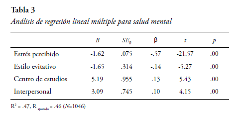 Asimismo, se encontraron diferencias estadísticamente significativas en los puntajes de salud mental en los estudiantes de Lima (M= 63.54, DE= 20.69) y los estudiantes de Huánuco (M= 66.00, DE= 19.27); t(-1.97), p= .04. Por lo cual, se decidió considerar a la variable centro de estudio en los análisis posteriores. Luego, se realizó un análisis de regresión lineal múltiple para estimar las variables que predicen la salud mental en el grupo de estudiantes universitarios de Lima y Huánuco. El modelo estuvo compuesto por las variables de estrés percibido, afrontamiento evitativo, centro de estudios y el área interpersonal, las cuales explican el 47% de la varianza del modelo (Tabla 2).