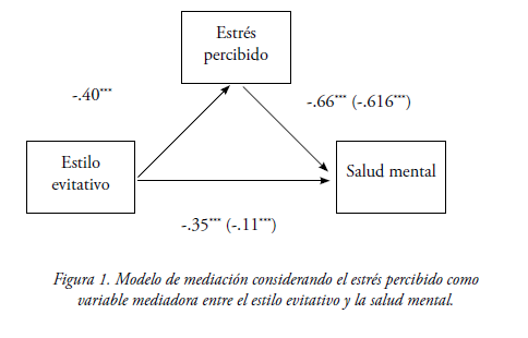 Finalmente, en la Figura 1 se muestran los resultados del test de Sobel que indican que el efecto del estrés percibido es estadísticamente significativo (Z= -3.11, p<.001) entre las variables de estilo evitativo y la salud mental.