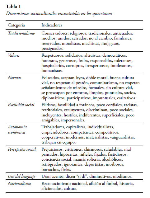En cuanto a las dimensiones socioculturales de los queretanos, se obtuvieron un total de 640 respuestas (indicadores), un promedio de 5.28 descriptores por persona. La Tabla 1, muestra las categorías logradas derivadas de lo señalado por los jóvenes universitarios. Se obtuvieron descripciones asociadas al tradicionalismo (conservadores, religiosos, machistas), los valores (respetuosos, solidarios, intolerantes) y las normas (educados, limpios, formales). Dos categorías muestran formas de pensar y actuar sobre grupos o personas en específico, como son la exclusión social (elitistas, hostiles, racistas) y la percepción social (prejuiciosos, criticones, saludables).
