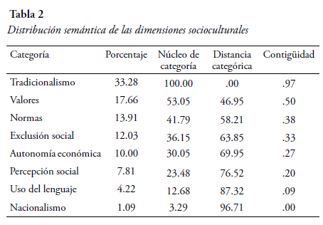 La riqueza semántica derivada de las dimensiones socioculturales se observa en la Tabla 2, en ella se aprecia el porcentaje obtenido para cada categoría, así como el NC, que indica que las primeras seis categorías (tradicionalismo, valores, normas, exclusión social, autonomía económica y percepción social) se encuentran por arriba del 25%. Las categorías uso del lenguaje y nacionalismo son la más distantes del NC, representado en esta ocasión por la categoría de tradicionalismo. La contigüidad obtenida para las dimensiones socioculturales, señala que las categorías más afines entre sí con un índice superior a .20, serían tradicionalismo, valores, normas, exclusión social, autonomía económica y percepción social.