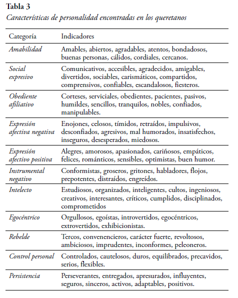 Por otra parte, el hecho de identificar categorías referentes a características de personalidad, evidencia la presencia de rasgos del mexicano en general y del queretano en particular. Las características de personalidad identificadas en el presente estudio, pueden ser entendidas como características relativamente permanentes de la personalidad de un individuo que se manifiestan en diferentes situaciones y que se representan por medio de indicadores descriptivos que llevan acabo las personas (Palacios, 2015c).