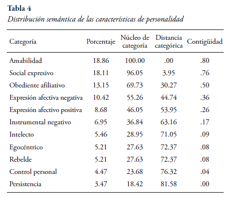 La Tabla 4 muestra el porcentaje obtenido para cada categoría, así como la riqueza semántica derivada de las características de personalidad. Se aprecia que las categorías control personal y afirmativo se encuentran por debajo del 25% del NC, y la categoría afirmativo es la más distante del NC, representado por la amabilidad. En términos de contigüidad, las categorías más afines entre sí, con un índice superior a .20, serían amabilidad, social expresivo, obediente afiliativo, expresión afectiva negativa y positiva.