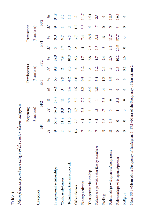 Table 1 presents data on the mean frequency and respective percentages of the Session Theme categories. The most prominent category for both participants in the beginning and development phases of the therapy was Interpersonal Relationships. At the end of therapy, in the period called Termination, for P2, Interpersonal Relationships remained the most frequent, while for P1 Relationships with Spouse/ Partner had the highest mean.