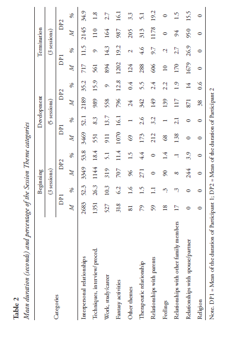 Table 2 presents the mean duration in seconds and percentages for the categories of the themes, for both participants. Regarding the mean time of each category per session, the one that stood out was Interpersonal Relationships in the Beginning and Development phases of the therapy for both clients, as well as in the Termination phase for P2. In the final phase of the therapeutic process there was a considerable increase in the category Relationships with spouse/partner for P1, going from a mean of zero to 26.9%.