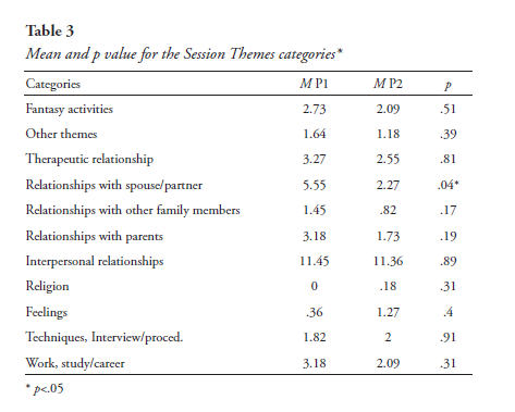 The thematic categories suggested by Zamignani and used in this work were: (1)Therapeutic relationship, (2)Relationships with spouse/partner, (3)Relationships with children or stepchildren, (4) Relationships with parents or stepparents, (5)Relationships with other family members, (6)Work, (7)Study and/or career, (8)Religion, (9) Interpersonal relationships, (10)Feelings in general, (11)Judgments or tendencies for action, (12)Existential questions, (13)Traumatic events, (14)Fantasy activity or game, (15)Development of techniques/procedures or interviews, (16)Psychiatric complaints and medical symptoms, and (17)Other issues (Zamignani, 2007).