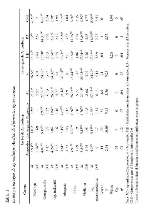 Luego se examinaron diferencias en las dimensiones de estilos y estrategias según carrera. Para ello se aplicó una prueba ANOVA de una vía con contraste post hoc Tukey. Se observaron múltiples diferencias estadísticamente significativas en todas las dimensiones a excepción del estilo Asimilador (Tabla 1).
