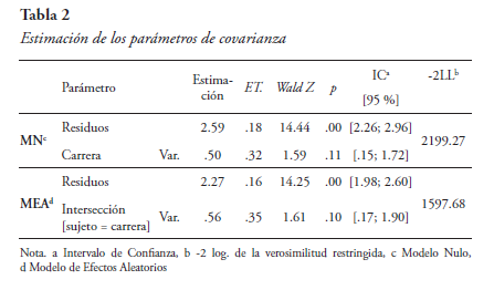Los resultados presentados en la tabla 2 permiten comparar el modelo nulo con el de efectos aleatorios. Comenzando por el nivel que integra a la totalidad de los estudiantes se observó, mediante el análisis de los residuos tanto para el modelo nulo como para el EA, un valor del estadístico Wald significativo, indicando ello que el rendimiento académico varía entre todos los estudiantes, incluso entre los educandos de las mismas carreras. Al comparar las estimaciones de ambos modelos se registró una leve disminución en la varianza del modelo EA (2.27) en comparación con el nulo (2.59). Tal diferencia implica que las dimensiones de estilos y estrategias incluidas en el modelo EA ayudarían a disminuir en proporción relativa la variabilidad del rendimiento académico en el conjunto de los estudiantes.