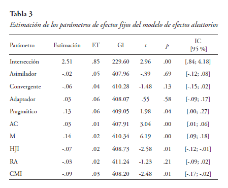 Pasando ahora al análisis de los parámetros estimados de efectos fijos del modelo, los mismos se resumen en la tabla 3. Como puede verse, el valor de la intersección fue positivo y significativo lo que estaría indicando que el rendimiento académico medio entre carreras no es el mismo o bien es distinto de cero. Por otro lado, las estimacion es correspondientes a las covariables mostraron que de las nueve variables incluidas en el modelo solo cinco lograron explicar de modo significativo el rendimiento académico, ellas fueron el estilo Pragmático, y las estrategias de Aprendizaje Colaborativo, Motivación, Habilidades para Jerarquizar la Información y Competencias para el Manejo de la Información 2.0. Como puede verse algunas estimaciones fueron positivas y otras negativas, pudiéndose interpretar que el rendimiento académico se incrementa en .13, .03, .14, .07 y .09 cuando las variables de estilo Pragmático, y las estrategias de Aprendizaje Colaborativo y Motivación se incrementan en un punto y las de Habilidades para Jerarquizar la Información y Competencias para el Manejo de la Información 2.0 decrecen en un punto respectivamente.
