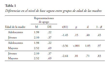 En los análisis exploratorios, se encontró que el guion de base segura y la edad de la madre se correlacionan de manera significativa (r = .41, IC 95% = [.28, .58]), p < .001). Asimismo, al comparar el nivel de base segura del guion en los diferentes grupos de edad: adolescentes (15 a 19 años), jóvenes (20 a 30 años) y mayores (31 a 45 años) se encontraron diferencias significativas (F (2) = 9.33, p < .001). Tal como se observa en la Tabla 1, la comparación por pares, evidencia que madres mayores tienen mayor nivel de base segura que las madres adolescentes y las madres jóvenes, mientras que las madres adolescentes y las madres jóvenes no difieren en su nivel de base segura.