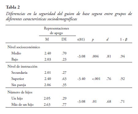 Por otro lado, tal como se observa en la Tabla 2, los análisis preliminares mostraron diferencias significativas en el nivel de base segura del guion de las madres a partir del nivel socioeconómico, el grado de instrucción y el número de hijos. De la misma manera, la correlación del guion con el nivel de instrucción de la madre es significativa (r = .38, IC 95% = [.22, .52]), p < .001), así como con el número de hijos (r = .39, IC 95% = [.18, .59]), p < .001) y con el nivel socioeconómico (r = .40, IC 95% = [.19, .57]), p < .001).