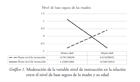 Tal como se observa en el Gráfico 1, el análisis de moderación demostró que en el grupo de madres con un mayor nivel de instrucción, el nivel de base segura se incrementa con la edad, mientras que en el grupo de madres de menor nivel de instrucción, el nivel de base segura disminuye conforme se incrementa la edad de la madre.