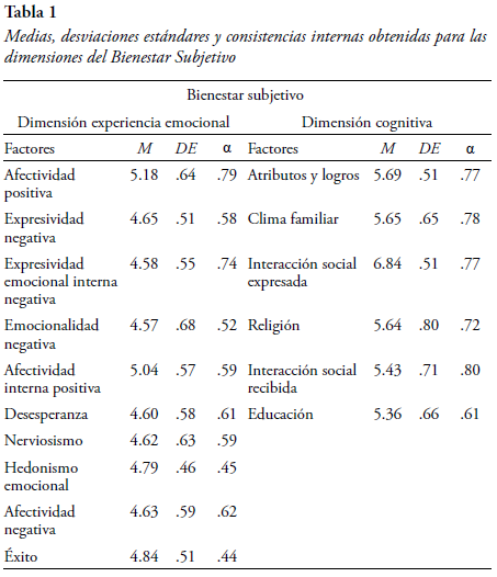 La variable Bienestar Subjetivo fue medida por medio de la Escala Multidimensional para la Medición del Bienestar Subjetivo llamado EMMBSAR (Anguas Plata & Reyes Lagunes, 1999, 2000) que fue construida para la población mexicana. Esta escala incluye dos dimensiones: Experiencia emocional y evaluación sociocognitiva. Los resultados obtenidos por los autores en un análisis factorial exploratorio mostraron que la experiencia emocional mide los aspectos emocionales y afectivos, y está compuesto por diez factores: afectividad positiva (α=.85), expresividad negativa (α=.87), afectividad negativa (α=.83), esperanza (α=.83), desesperanza (α=.83), afectividad interna positiva (α=.81), hedonismo emocional (α=.83), nerviosismo (α=.83), depresión (α=.82) y éxito (α=.81). En la dimensión de evaluación afectivo-cognitiva se incluyen ocho factores: clima familiar (α=.89), interacción social percibida (α=.85), logros (α=.84), calidad de vida (α=.76), interacción social expresada (α=.64), logros nacionales (α=.81), religión (α=.80) y educación (α=.77). Los índices de confiabilidad interna de este instrumento son: Para la experiencia emocional es de α=.90, explicando 72.45 % de la varianza y en la dimensión evaluación afectivo-cognitivo es de α=.94, cuyos factores explican el 61.38% de la varianza. Es importante señalar que dado la longitud del instrumento y el tipo de muestra se consideró pertinente contar con una versión corta del instrumento, de manera que se utilizaron los primeros cinco reactivos con el peso factorial más alto de cada factor.