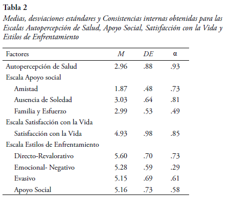 En cuanto a la variable Apoyo social se administró la Escala de Apoyo Social Percibido llamada CASPE (Calvo Francés & Díaz Palarea, junio, 2004). Los autores señalan que el análisis factorial reveló tres factores: amistad (α=.83), ausencia de soledad (α=.81), familia y esfuerzo (α=.57) que explican en conjunto el 62.50% de la varianza total acumulada. La escala consta de 13 reactivos que, evalúan: la existencia de pareja y calidad de la relación, relaciones familiares en sus aspectos cuantitativos y cualitativos, las relaciones de amistad y compañerismo en sus aspectos cuantitativos y cualitativos, además de la participación en organizaciones socioculturales, esto se representa con valores que van del uno al cuatro. Se observan valores aceptables a nivel de consistencia interna α=.81 y para la fiabilidad según el método de dos mitades, exhibiendo un α=.72.