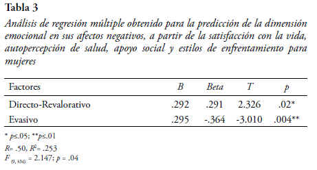 En cuanto al análisis de regresión múltiple para hombres no se obtuvo un modelo estadísticamente significativo para el Bienestar Subjetivo en los Afectos Negativos. Por el contrario, como lo muestra la tabla 3 el análisis de regresión múltiple para las mujeres encontró que los Estilos de Enfrentamiento Directo-Revalorativo y Evasivo son buenos predictores del Bienestar Subjetivo en los Afectos Negativos.