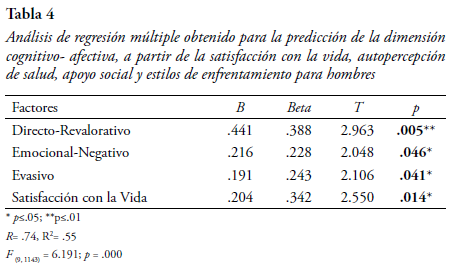 La tabla 4 muestra las regresiones múltiples para en el Bienestar Subjetivo en la dimensión cognitiva para los hombres. Se puede destacar que para este grupo las variables Satisfacción con la Vida, los Estilos de Enfrentamiento Emocional-Negativo, Directo-Revalorativo y Evasivo resultaron ser los mejores predictores para esta dimensión.