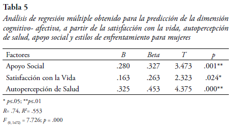 En cuanto a las mujeres la Autopercepción de Salud, el factor Apoyo Social, la Satisfacción con la Vida y el estilo de enfrentamiento Emocional-Negativo son los mejores predictores del Bienestar Subjetivo en la Dimensión Cognitiva (ver tabla 5).