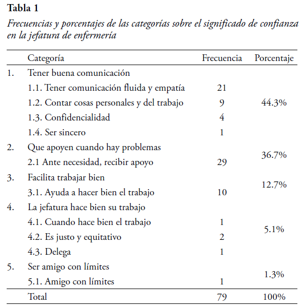 Dado que algunas de las 65 entrevistas procesadas hicieron mención a más de un aspecto para explicar qué significaba confiar en las jefaturas, el total de referencias analizadas fue de 79. Se obtuvieron 5 categorías, sin embargo, tres son las principales ya que cubren el 93.71% de las menciones (ver Tabla 1).