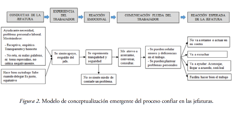 A partir de los resultados discutidos y, en especial, del ordenamiento creado en la Figura 1, donde se presenta un modelo emergente del proceso de confiar en la jefatura al contexto de la cultura latinoamericana, se propone una nueva definición de confianza en la jefatura: Es la decisión del funcionario de correr un riesgo y establecer una comunicación fluida y honesta con su jefatura, basado en el sentimiento de seguridad que experimenta ante el apoyo emocional o ayuda instrumental brindada por la jefatura cuando enfrenta problemas en su puesto de trabajo o dificultades personales.