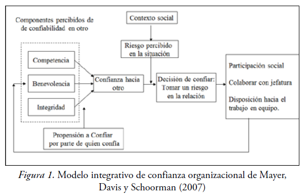 La confianza enla jefatura se puede definir como un proceso dinámico en el tiempo en el que los trabajadores llegan a tomardecisiones que implican creer y sentir que la jefatura actuará favorablemente hacia ellos sin tener certeza alrespecto, y sin existir oportunidad de conocer o controlar la manera comorealmente actuará (Yáñez &Valenzuela, 2013). Para Wasti et al. (2011) y Heynsy Rothmann (2015) un modelo integrativo muy influyente, considerado fundacional sobreconfianza interpersonal en las organizaciones, es el desarrollado por Mayer, Davisy Schooman (1995, 2007). Este ha sido avalado por la revisión realizada por Colquitt, Scott, y LePine (2007) y adecuado a la situación específica de la confianza hacia la jefatura (Burke, Sims, Lazzara& Salas, 2007). El modelo de Mayer, Davisy Schooman (2007) entre otros aspectos aporta condistinguir entre: (a) la conducta de decidir confiar en otro, (b) determinantesdel contexto social y (c) dos determinantes cognitivos, la predisposición aconfiar y la percepción de confiabilidad del otro. De especial interés esexplicar este último.