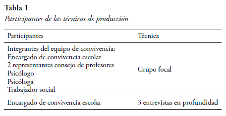 En un primer momento se realizó un grupo focal como manera preliminar de recabar información relativa a la participación del ECE en la escuela. Como indica Korman (2003), el grupo focal es una reunión de un grupo de individuos seleccionados por los investigadores para discutir y elaborar, desde la experiencia personal, una temática o hecho social que es objeto de investigación (Mella, 2000). En este caso, los participantes fueron los integrantes del equipo de convivencia escolar (asistente social, psicólogo primer ciclo, psicólogo segundo ciclo, docente primer ciclo, docente segundo ciclo y ECE), ya que se sostuvo como criterio aquellos que mantenían una cercanía y comunicación constante con la figura del ECE (ver Tabla 1).