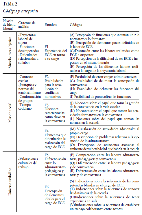El análisis de contenido permitió crear 22 códigos y 6 Familias (F) de clasificación. Estos elementos fueron relacionados con los tres niveles de la identidad laboral definidos con anterioridad, y que forman parte de los objetivos específicos de la investigación (Tabla 2).