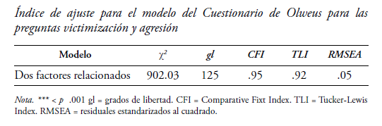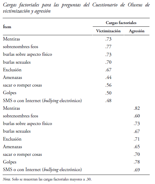 En lo referente al análisis factorial exploratorio del instrumento, en la muestra de 824 alumnos emergían dos factores que explicaban un 51% de la varianza. Los dos factores se llamaron victimización y agresión; el primero se componía de las nueve preguntas de victimización y el segundo, de las nueve de agresión. Se observaron adecuadas cargas factoriales y no existían cargas cruzadas mayores a .30. El análisis factorial confirmatorio en la muestra de 1756 alumnos también arrojó un adecuado modelo de medición (CFI = .95 y TLI = .92) con dos factores relacionados para los nueve ítems de victimización y agresión, respectivamente. Dichos resultados concuerdan con la estructura factorial hallada por Kyriakides et. (2006) en población chipriota griega, Hartung et al. (2011) en una muestra norteamericana y Breivik y Olweus (2015) en muestras noruegas.